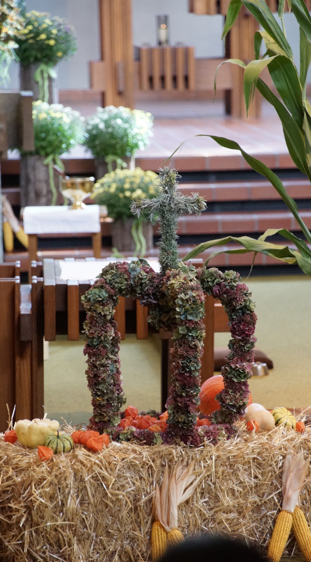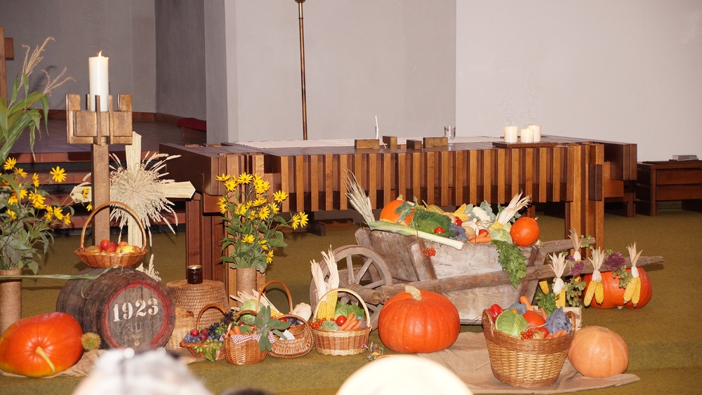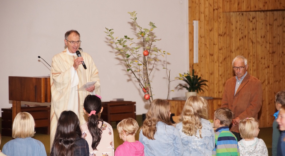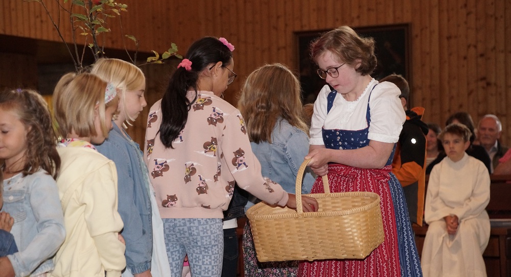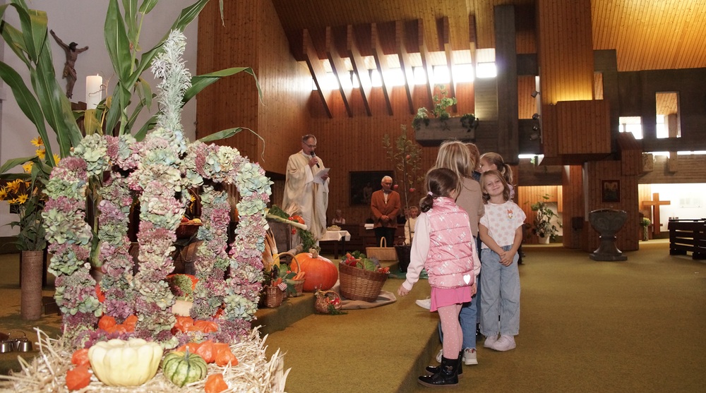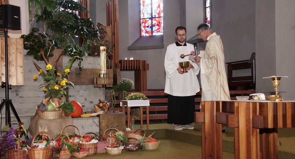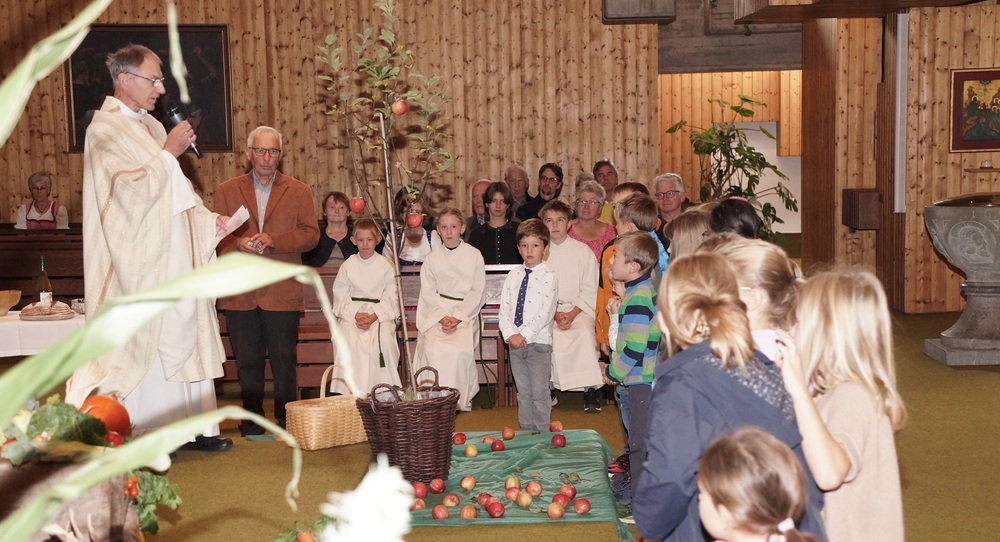 Vereinsmitglieder wirkten aktiv mit, unser Blumenschmuckteam dekorierte den Altarraum mit einer großen Auswahl an Obst, Gemüse und Getreide, und viele Besucher stellten Früchtekörbe zur Segnung hin. Die zahlreichen Kinder wurden von Vikar Gerold in die Messe einbezogen und brachten Leben in die Kirche, Andrea und Reinhold Walser sorgten für die schwungvolle musikalische Begleitung.