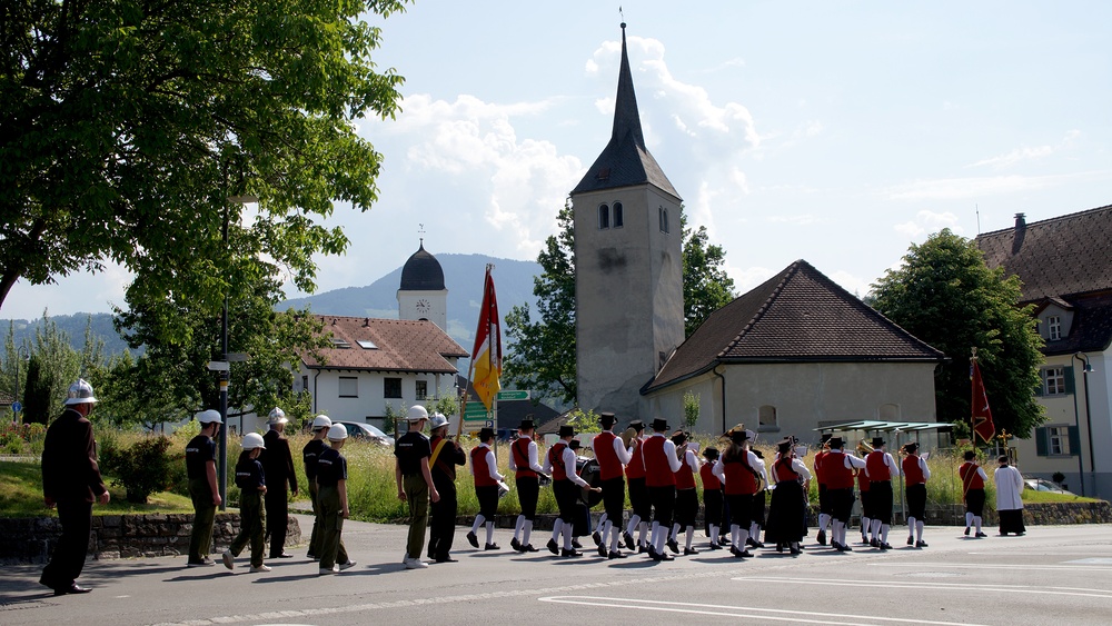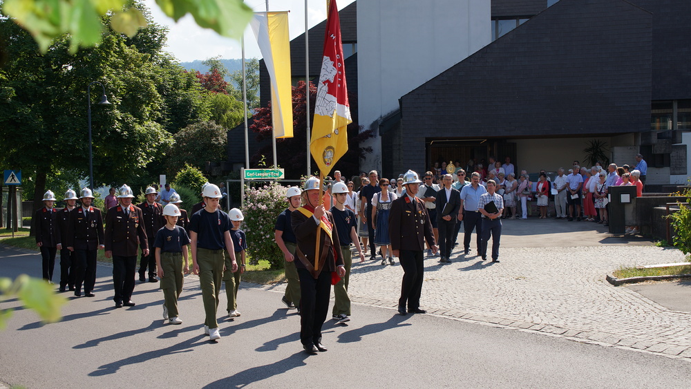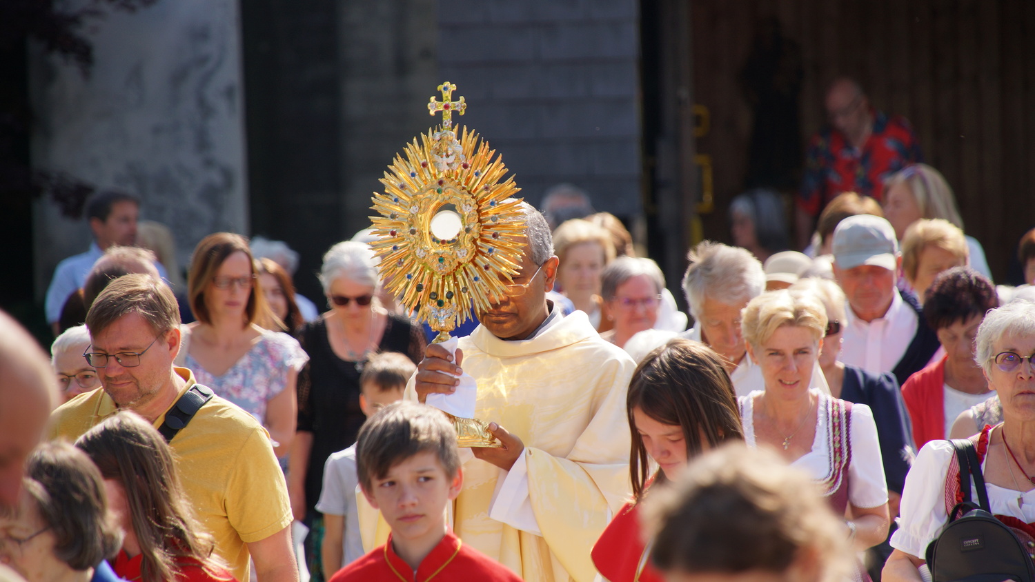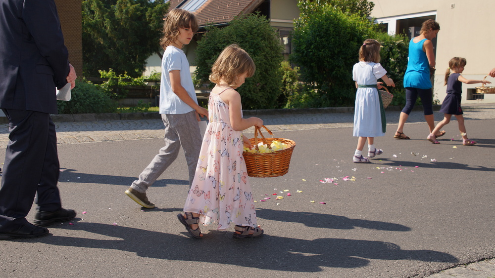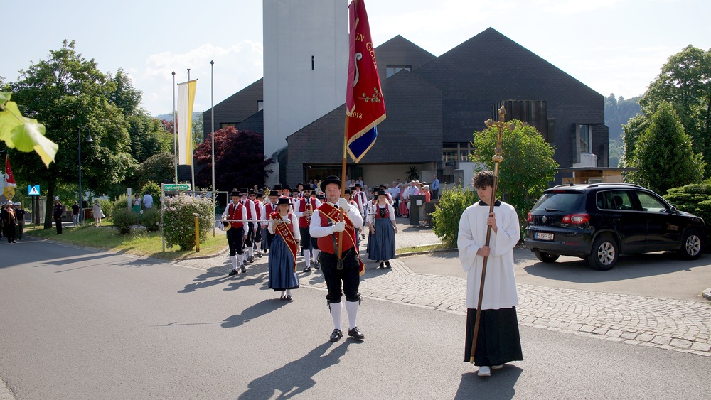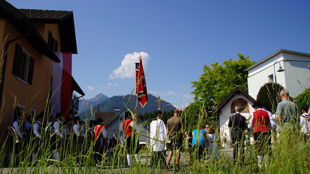 Und diese Tradition wurde auch heuer wieder bei besten Bedingungen gepflegt. Es ist immer beeindruckend, wenn sich unter Beteiligung von Feuerwehr, Musikverein und Kirchenchor ein großer Menschenzug von der Kirche weg am Gemeindeamt vorbei nach Büttels bewegt. Die goldene Monstranz mit der Hl. Kommunion, getragen von Pfarrer Georg Thaniyath, glänzt aus der Menge heraus.