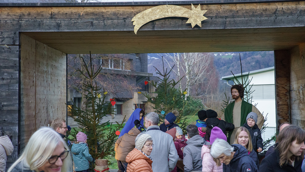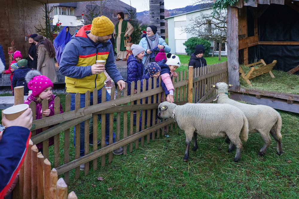 Im bugo-Garten gab es leckere Brezeln, warmer Apfelsaft und Glühmost. Ebenso konnte die Krippe mit den menschengroßen Figuren und den Schafen im Gehege bestaunt werden.