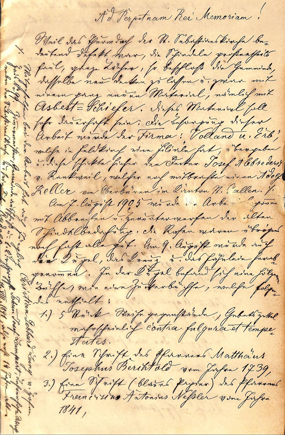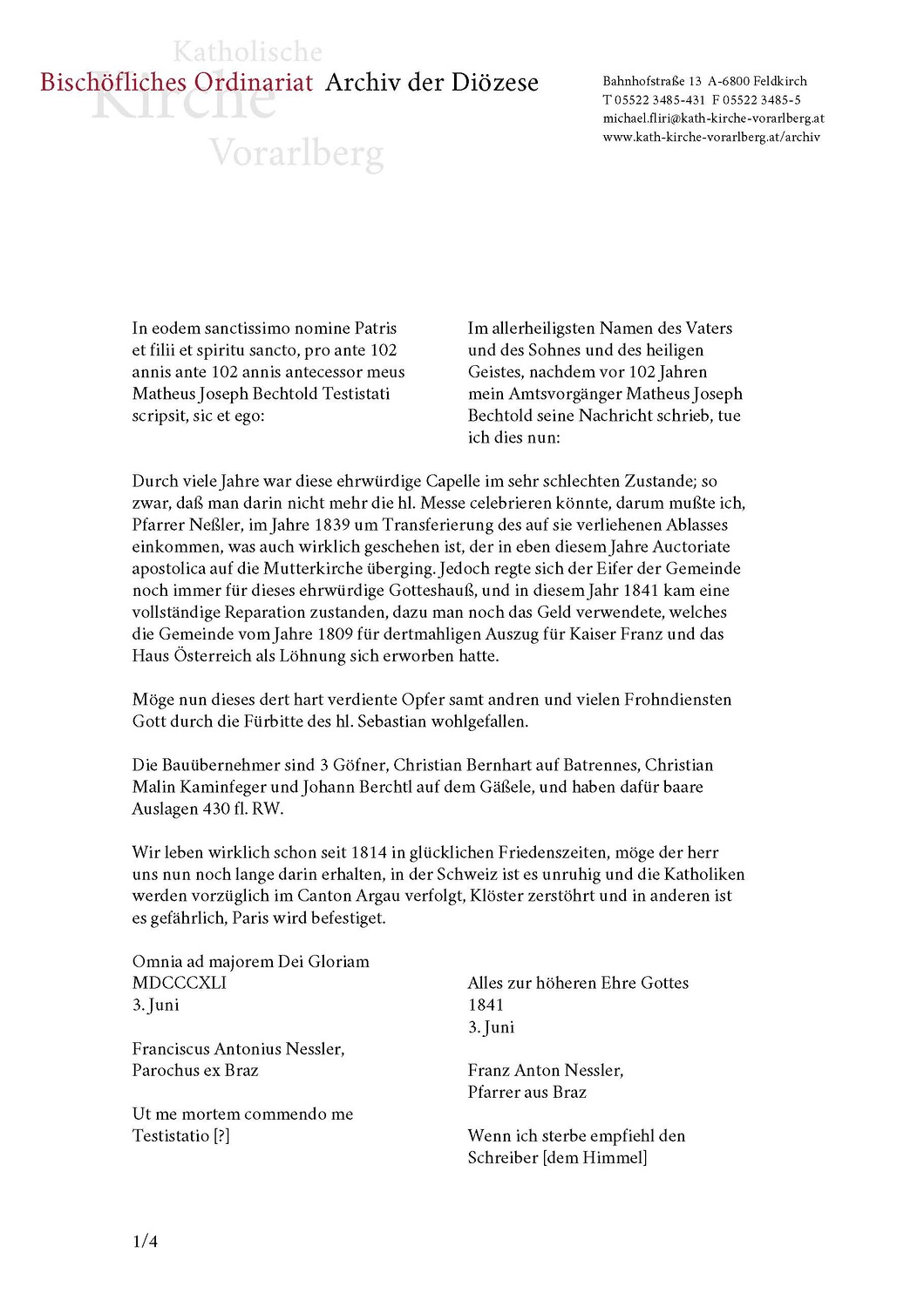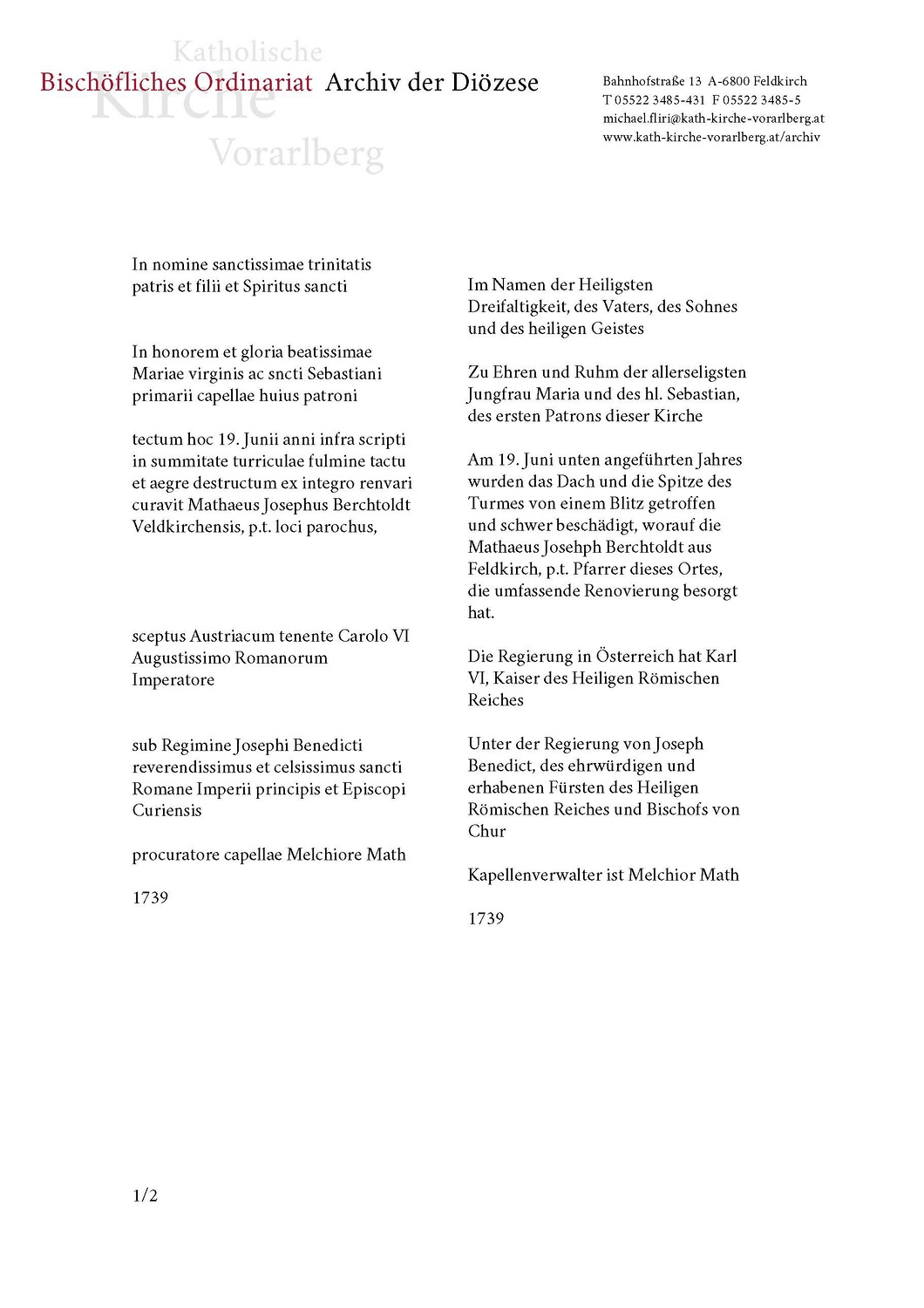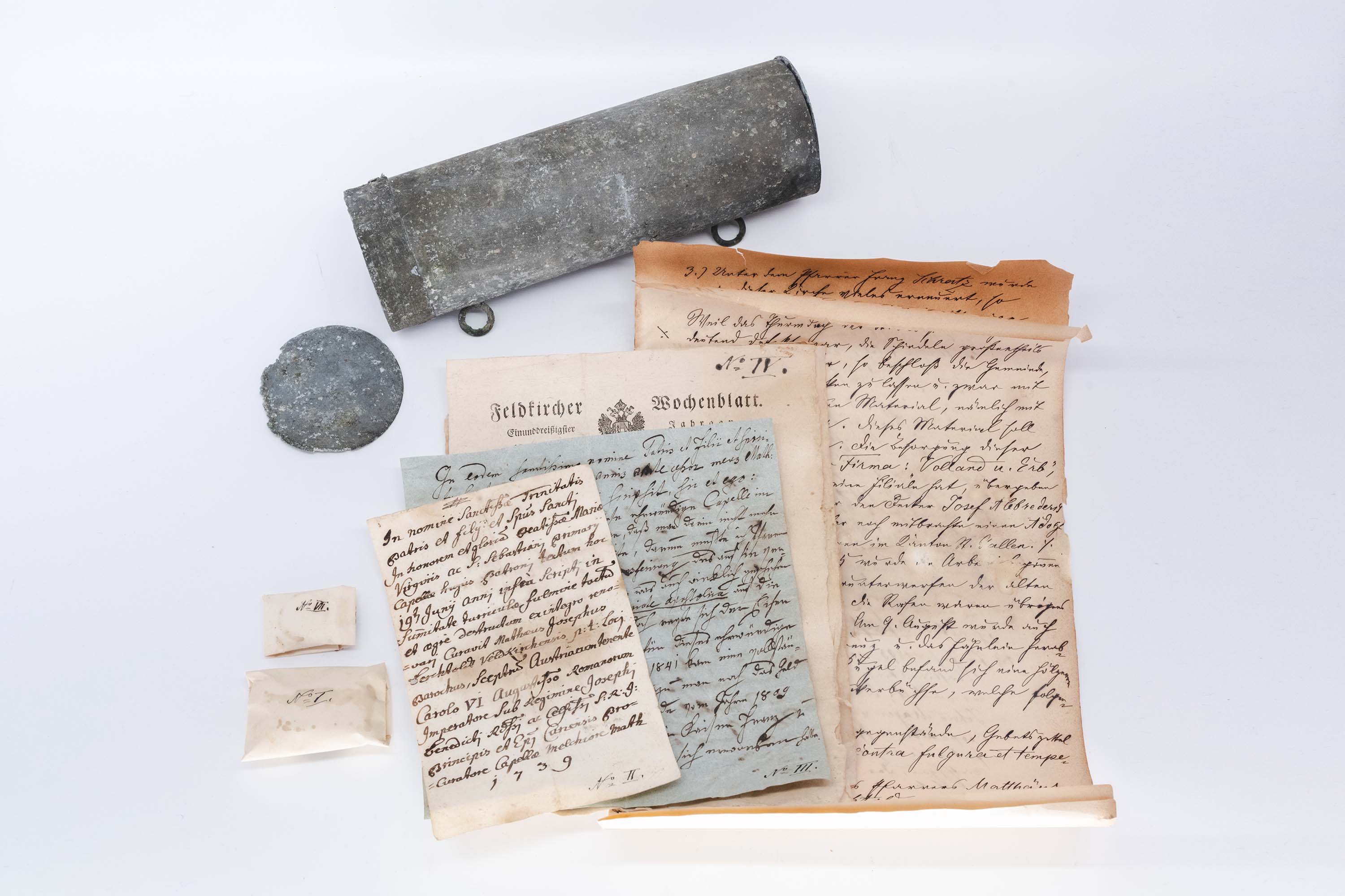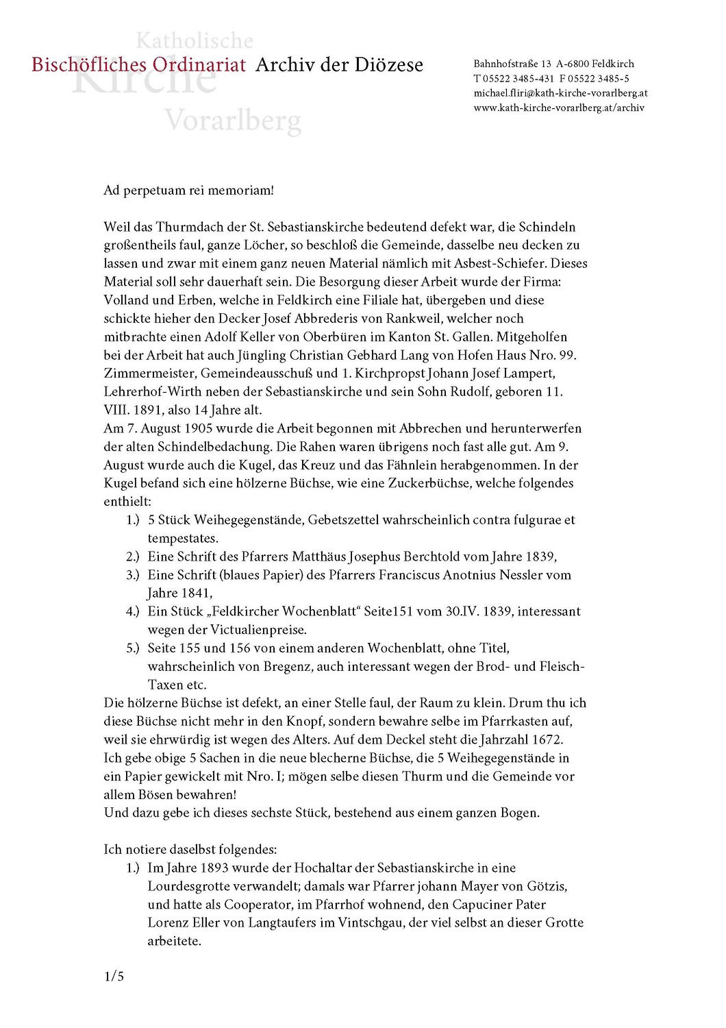 Bei der für die Restaurierung notwendigen Demontage des Kreuzes und der Kugel wurde die Kugel geöffnet und es konnten drei von den jeweiligen Pfarrern handgeschriebene Schriftstücke entnommen werden, die sich witterungsgeschützt in einer Metallkapsel befanden. Die Schriftstücke aus dem Jahr 1739, 1841 und 1905 beschreiben die in ihrer Zeit stattgefundenen Sanierungsarbeiten. Aus dem Jahr 1905 stammen die Münzbeilagen und ein Exemplar des Feldkircher Wochenblattes.