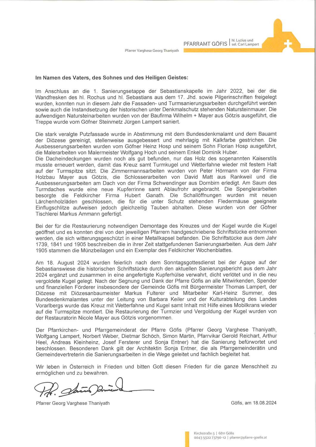 Am 18. August 2024 wurden feierlich nach dem Sonntagsgottesdienst bei der Agape auf der Sebastianswiese die historischen Schriftstücke durch einen aktuellen Sanierungsbericht ergänzt und zusammen in eine angefertigte Kupferhülse verwahrt, dicht verlötet und in die neu vergoldete Kugel gelegt. Nach der Segnung und Dank der Pfarre Göfis an alle Mitwirkenden, Spender und finanziellen Förderer insbesondere der Gemeinde Göfis, der Diözese, des Bundesdenkmalamtes und der Kulturabteilung des Landes Vorarlberg wurde das Kreuz mit Wetterfahne und Kugel samt Inhalt mit Hilfe eines Mobilkrans wieder auf die Turmspitze montiert.