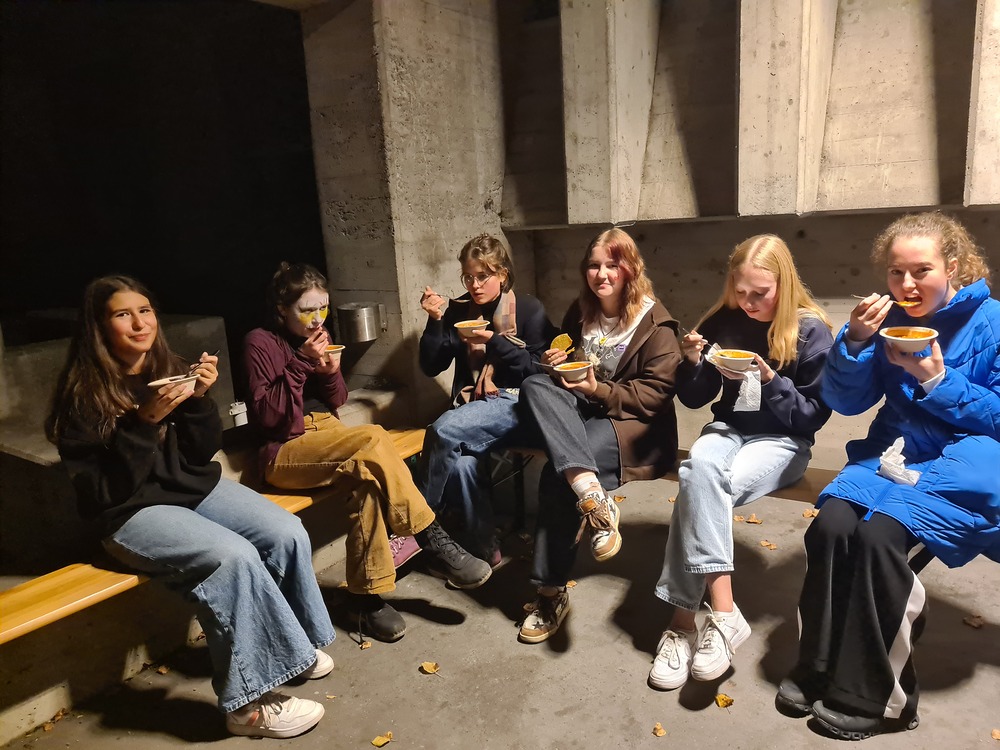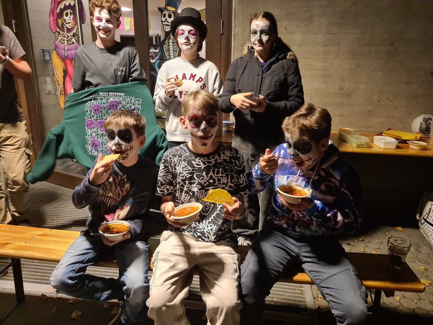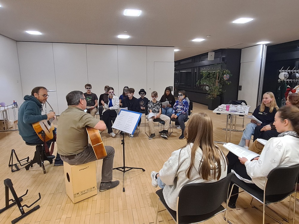 Ein besonderes Highlight des Abends war das gemeinsame Singen mit Paul und Michael. Die beiden schwangen ihre Gitarre und sorgten für eine lebendige und lustige Atmosphäre am Fest der Toten. Das Fest bot den Jugendlichen die Möglichkeit, auf eine kreative und herzliche Weise über die Themen Tod und Erinnerung nachzudenken und dabei eine schöne Zeit in Gemeinschaft zu verbringen. Vielen Dank an alle, die dabei waren und mitgeholfen haben, dass es ein so gelungener Abend geworden ist.