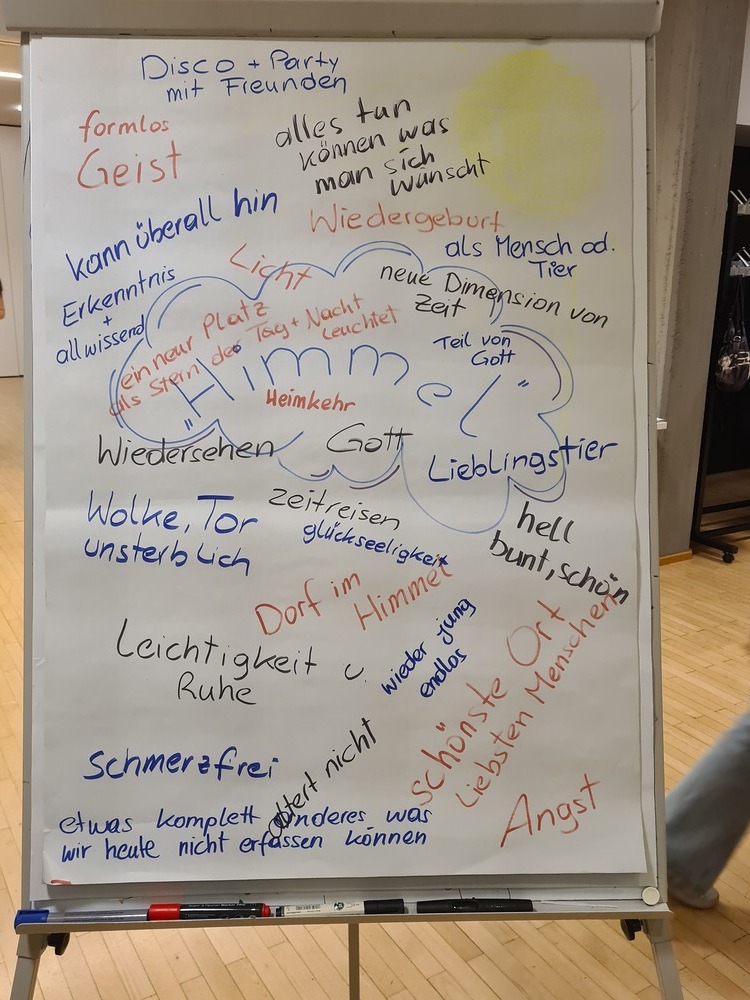 Zu Beginn dachten wir alle gemeinsam darüber nach, was wir uns unter dem "Himmel" vorstellen könnten. Die Gedanken waren sehr interessant. Sie sind dem Artikel in einem Bild beigefügt. Danach tauschten wir uns über die Vorstellungen von Leben und Tod aus und im Anschluß bemalten sich viele die Gesichter im Stil der bunten Totenköpfe. So ausgestattet machten wir uns bereit für das Lagerfeuer, wo es traditionelle Snacks und Getränke gab.