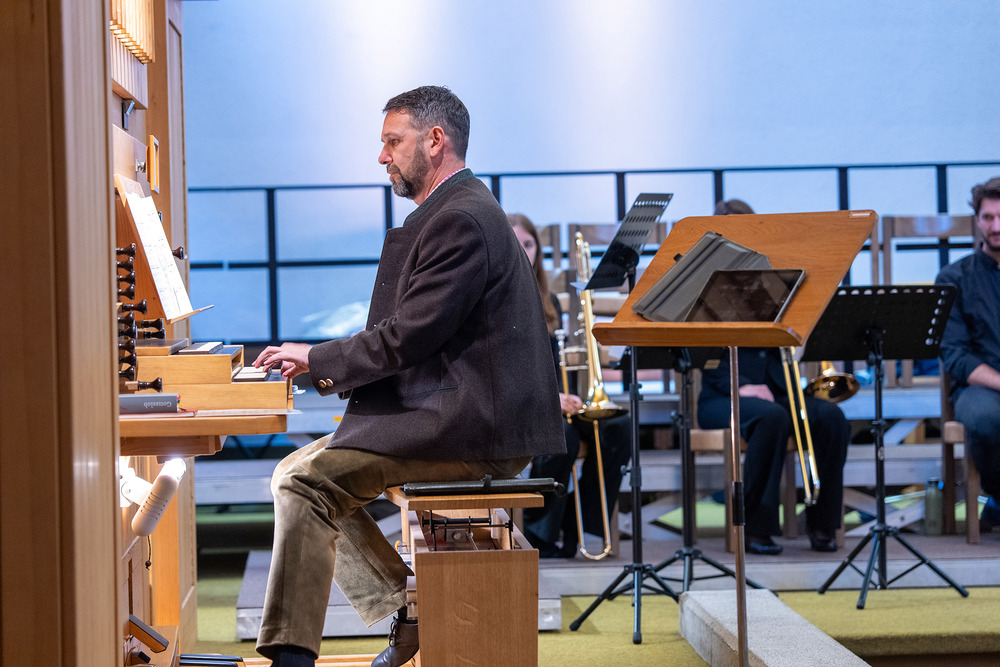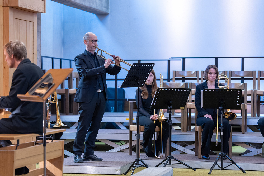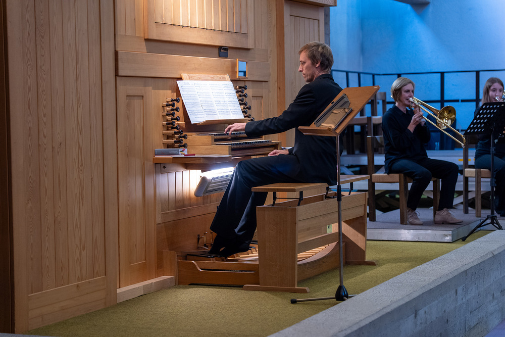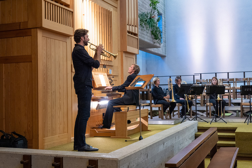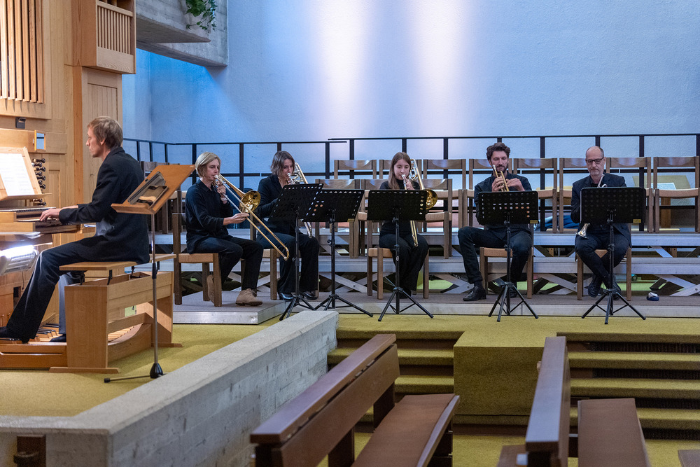 Das Jubiläumskonzert wurde mit dem „Feierlichen Einzug der Ritter des Johanniter-Ordens“ von Richard Strauss festlich durch das Bläserquintett von der Orgel begleitet eröffnet. Es folgte der „Göfner 4-Xang“ mit „Domine pacem da nobis“ von Jakob Christ. Die Ouvertüre aus der Suite in C-Dur von Georg Friedrich Händel, meisterhaft gespielt von Bernhard Lampert, begleitet von Philipp Sonderegger an der Orgel, war schon der nächste Höhepunkt des Abends. Martin Loretz spielte an der Orgel eine Toccatina in G-Dur sowie eine äußerst begeisternde Carl-Lampert-Improvisation.