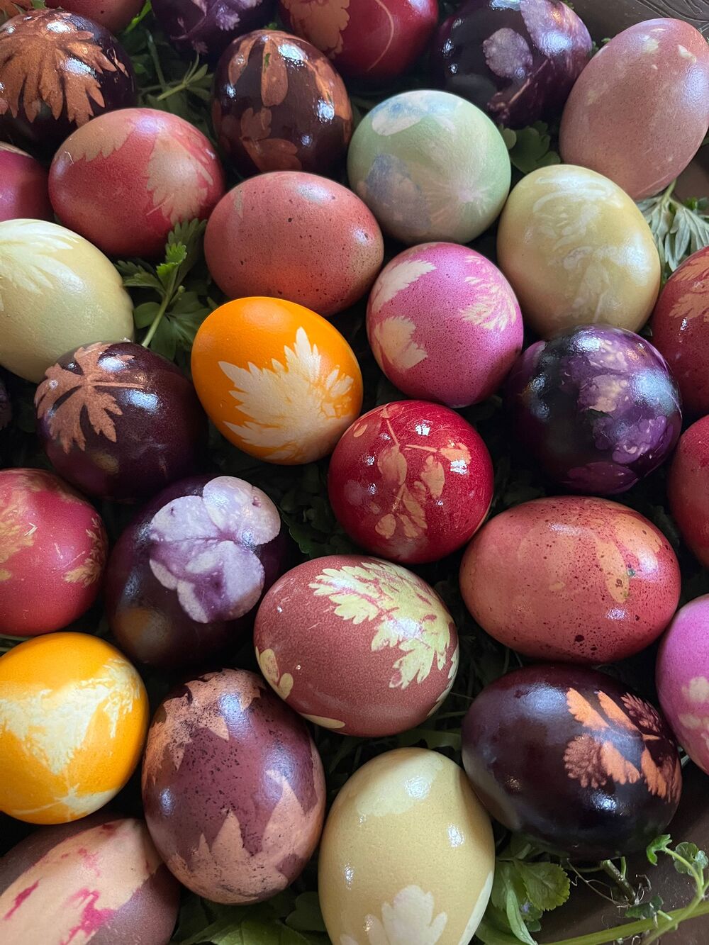 Gemeinsame Gestaltung von wunderschönen Ostereiern mit Pflanzenfarben.